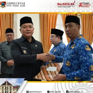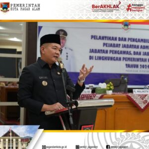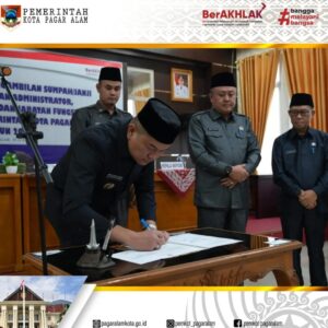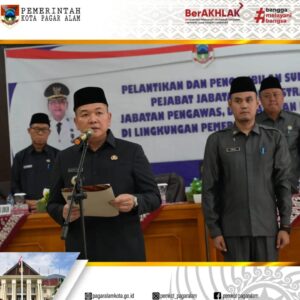 PAGAR ALAM – “Jabatan itu adalah amanah, silih berganti itu hal biasa, semoga hidup kita berkah, jabatan apapun kita terima,” pesan Pj Wali Kota H. Lusapta Yudha Kurnia usai melantik dan mengambil sumpah/janji terhadap 35 pejabat Jabatan Administrator, Pengawas dan Fungsional di lingkungan Pemkot Pagar Alam, bertempat di ruang rapat Besemah Due Setdako Pagar Alam, Jum’at siang (28/06/2024).