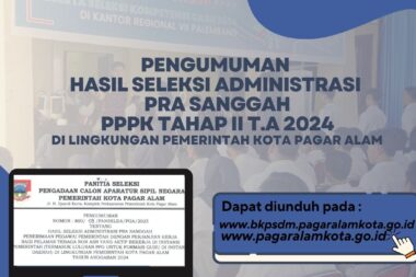 PENGUMUMAN HASIL SELEKSI ADMINISTRASI PRA SANGGAH PENERIMAAN PEGAWAI PEMERINTAH DENGAN PERJANJIAN KERJA BAGI PELAMAR TENAGA NON ASN YANG AKTIF BEKERJA DI INSTANSI PEMERINTAH (TERMASUK LULUSAN PPG UNTUK FORMASI GURU DI INSTANSI DAERAH) DI LINGKUNGAN PEMERINTAH KOTA PAGAR ALAM TAHUN ANGGARAN 2024