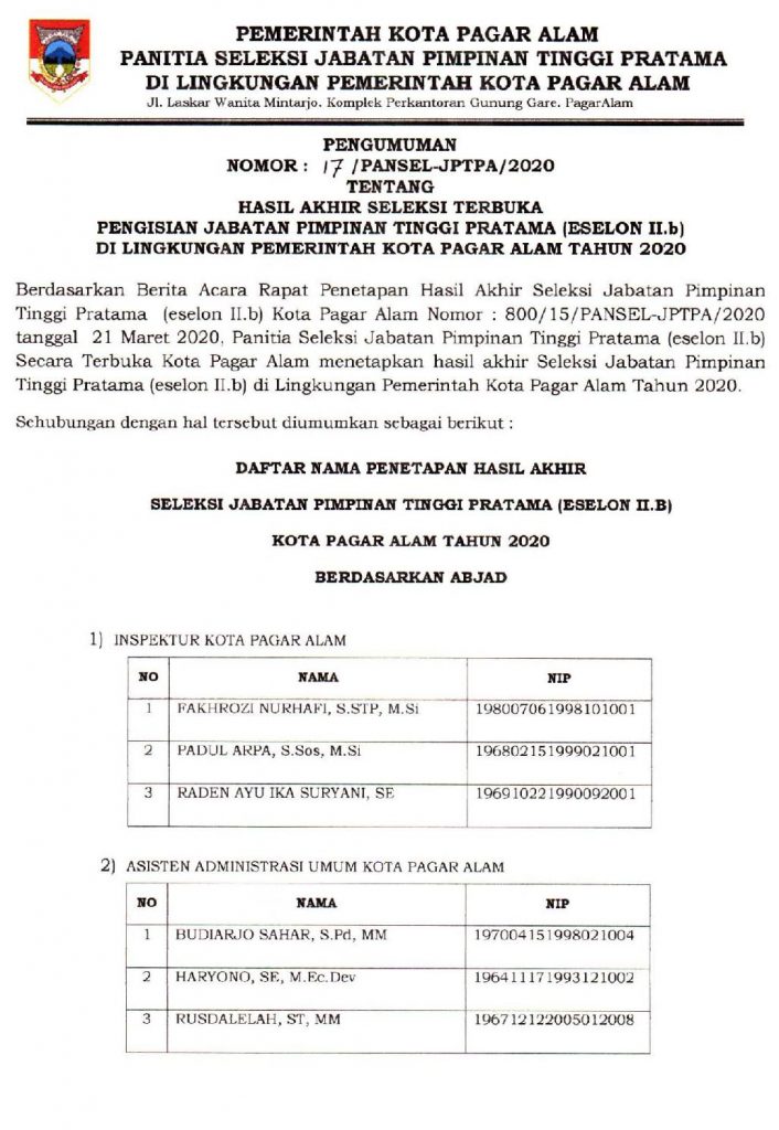 HASIL AKHIR SELEKSI TERBUKA, PENGISIAN JABATAN PIMPINAN TINGGI PRATAMA (ESELON II.b)