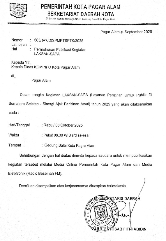 Selamat dan Sukses atas dilantiknya Sekretaris Daerah Kota Pagar Alam, Bapak Zaily Oktosab Fitri Abidin, AP., M.Si, Jumat, 12 Desember 2025.