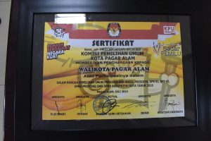 Komisi Pemilihan Umum (KPU) Kota Pagar Alam menyerahkan hasil pleno terbuka penetapan perolehan kursi partai politik (parpol) dan penetapan calon terpilih anggota DPRD Kota Pagar Alam, hasil Pemilu Legislatif Tahun 2019, kepada Pemkot Pagar Alam.
