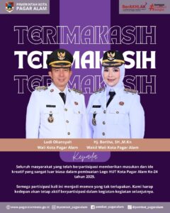 Pemerintah Kota Pagar Alam mengucapkan terima kasih kepada masyarakat yang telah berpartisipasi memberikan masukan dan ide kreatif dalam pembuatan Logo HUT Kota Pagar Alam ke-24 tahun 2025.