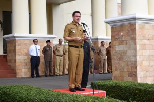 Walikota Alpian Maskoni memimpin apel awal bulan, sekaligus dalam rangka memperingati HUT Damkar ke-100, Satpol PP ke-69, dan Satlinmas ke-57, di Halaman Kantor Walikota Pagar Alam, Senin (4/3/2019).
