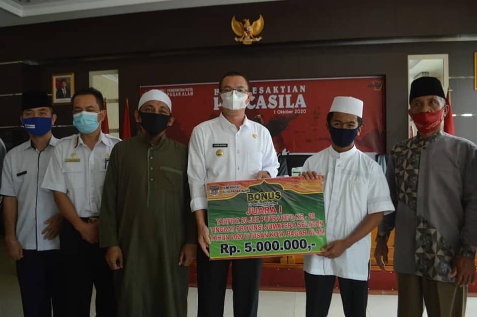 Walikota Pagar Alam Alpian Maskoni memberikan bonus kepada Muhammad Taufiqul Hakim Juara 1 Tahfidz Qur’an Golongan 20 Juz Putra pada Musabaqoh Tilawatil Qur’an (MTQ) ke XXIX Tingkat Provinsi Sumsel Tahun 2020, bertempat di Ruang Rapat Besemah II Setdako Pagar Alam, Rabu (07/10/2020).