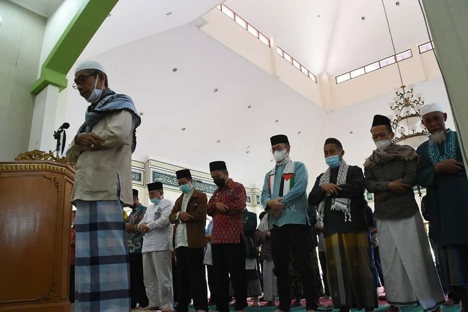 Walikota Pagar Alam Alpian Maskoni bersama Jajaran Pemkot Pagar Alam melaksanakan Sholat Ghaib yang di imami Ustadz Jamil Rusdi, dilanjutkan Do’a bersama dipimpin Ustadz Masrur Aminullah untuk saudara-saudara muslim di Palestina, bertempat di Masjid Al Akbar Gunung Gare, Jum’at (21/05/2021).