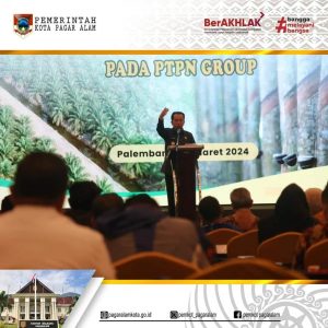PALEMBANG – Pj.Walikota Pagar Alam H. Lusapta Yudha Kurnia menghadiri pembukaan acara sosialisasi pelaksanaan proyek strategis nasional (PSN) pada PT. Perkebunan Nasional (PTPN) yang di laksanakan di hotel Wyndham Jakabaring Palembang, Kamis sore (28/03/2024).