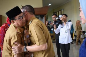 Usai acara, seluruh ASN yang diawali oleh Walikota Alpian Maskoni, Wakil Walikota Muhammad Fadli, Ketua TP-PKK, Wakil Ketua TP-PKK, dan diikuti para Asisten, Staf Ahli, kepala SKPD serta jajaran ASN, satu persatu menyalami Sekda Kota Pagar Alam H Safrudin, sembari berangkulan erat penuh haru. (Humas Diskominfo)
