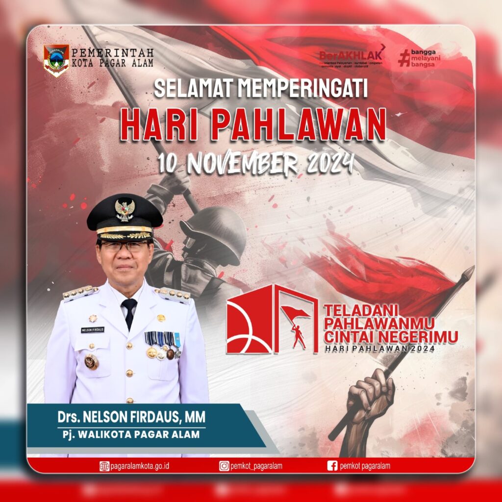 Pemerintah Kota Pagar Alam mengucapkan Selamat memperingati Hari Pahlawan, 10 November 2025. “Terus Bergerak Melanjutkan Perjuangan” #haripahlawan2025