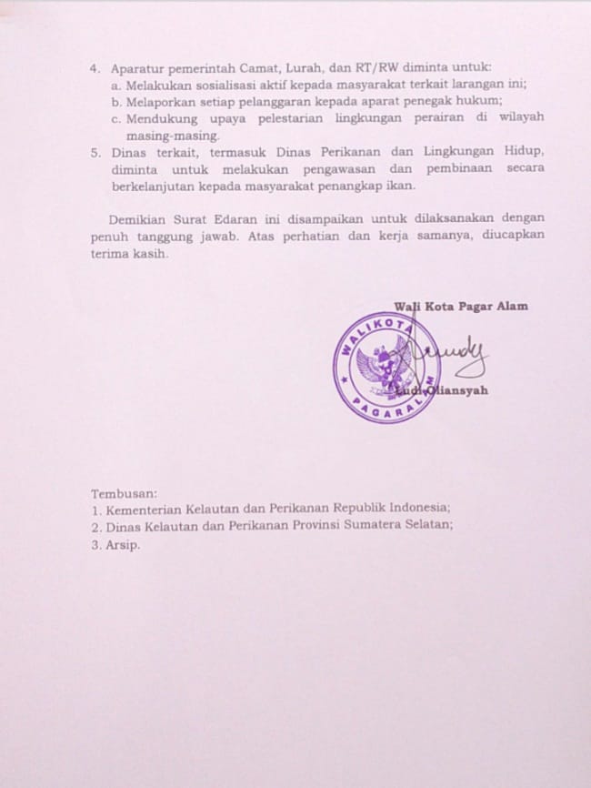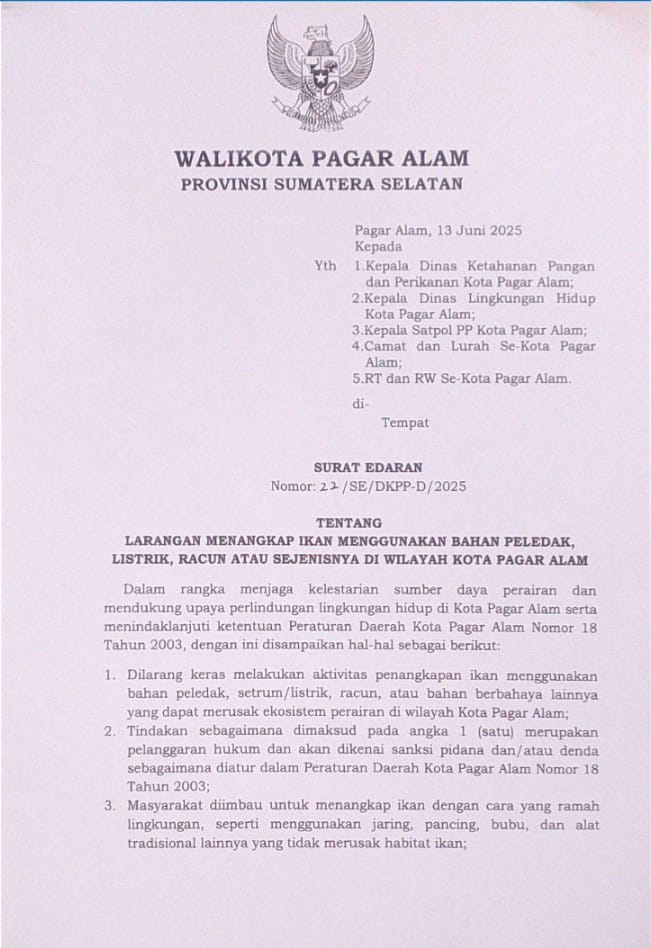 Surat Edaran : Larangan Menangkap Ikan Menggunakan Bahan Peledak, Listrik, Racun, atau Sejanisnya di Wilayah Kota Pagar Alam