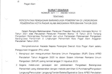SURAT EDARAN: Percepatan Pengadaan Barang/Jasa Pemerintah Di Lingkungan Pemkot Pagar Alam Anggaran Perubahan Tahun 2025