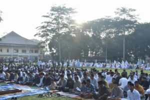 PAGAR ALAM – Walikota Pagar Alam Alpian Maskoni bersama Ketua TP KK Kota Pagar Alam Rachma Hareni Noor Alpian, Melaksanakan Sholat Idul Adha 1444 Hijriyah, di Lapangan Terminal Pagar Alam Selatan, Kamis (28/06/2023).