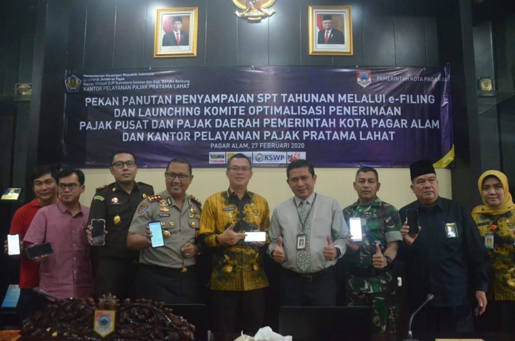 Walikota Alpian Maskoni menghadiri pekan panutan penyampaian Surat Pemberitahuan (SPT) Tahunan Pajak Penghasilan (PPh) Tahun 2019, yang diadakan Kantor Pelayanan Pajak (KPP) Pratama Lahat di ruang rapat Besemah I Setdako Pagar Alam, Kamis (27/02/2020).