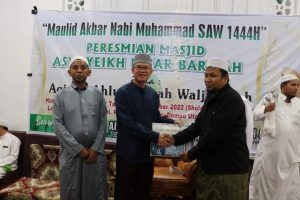 PAGAR ALAM – Wali Kota Pagar Alam Alpian Maskoni menghadiri Maulid Akbar Nabi Muhammad SAW 1444 H, sekaligus bersamaan dengan Al Habib Alwi bin Alwi bin Ali Al Habsyi meresmikan Masjid Asy-Syeikh Umar Barikah di Dusun Sandar Angin, kelurahan Rebah Tinggi, kecamatan Dempo Utara, rabu malam (23/11/2022).