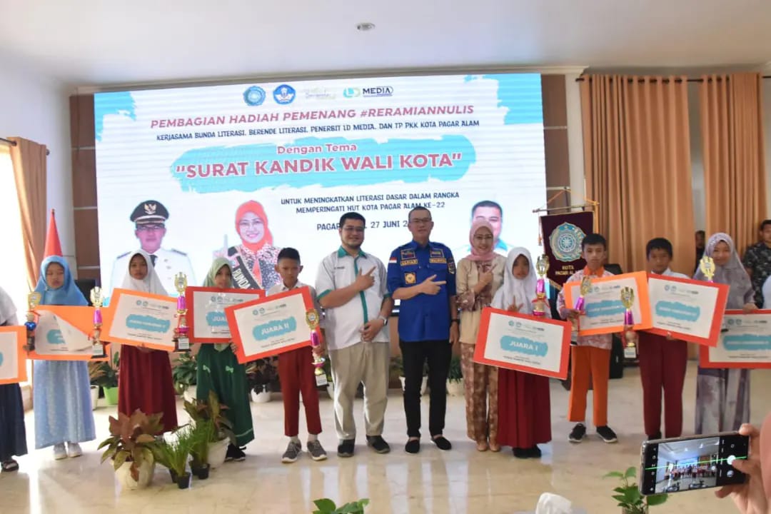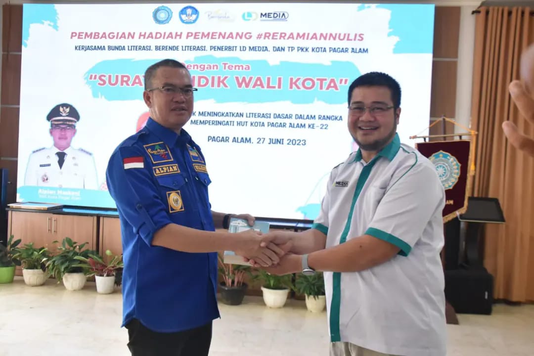 PAGAR ALAM – Selasa pagi (27/06/2023), Wali Kota Pagar Alam Alpian Maskoni menyerahkan hadiah kepada para pemenang Lomba #Reramiannulis, dengan tema “Surat Kandek Wali Kota”, bertempat di Griya Tegur Wangi, Kota Pagar Alam.