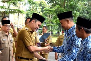 Wakil Walikota Muhammad Fadli menyerahkan penghargaan kepada sejumlah ASN yang purna tugas, di Halaman Kantor Walikota Pagar Alam, Senin (4/1/2019).